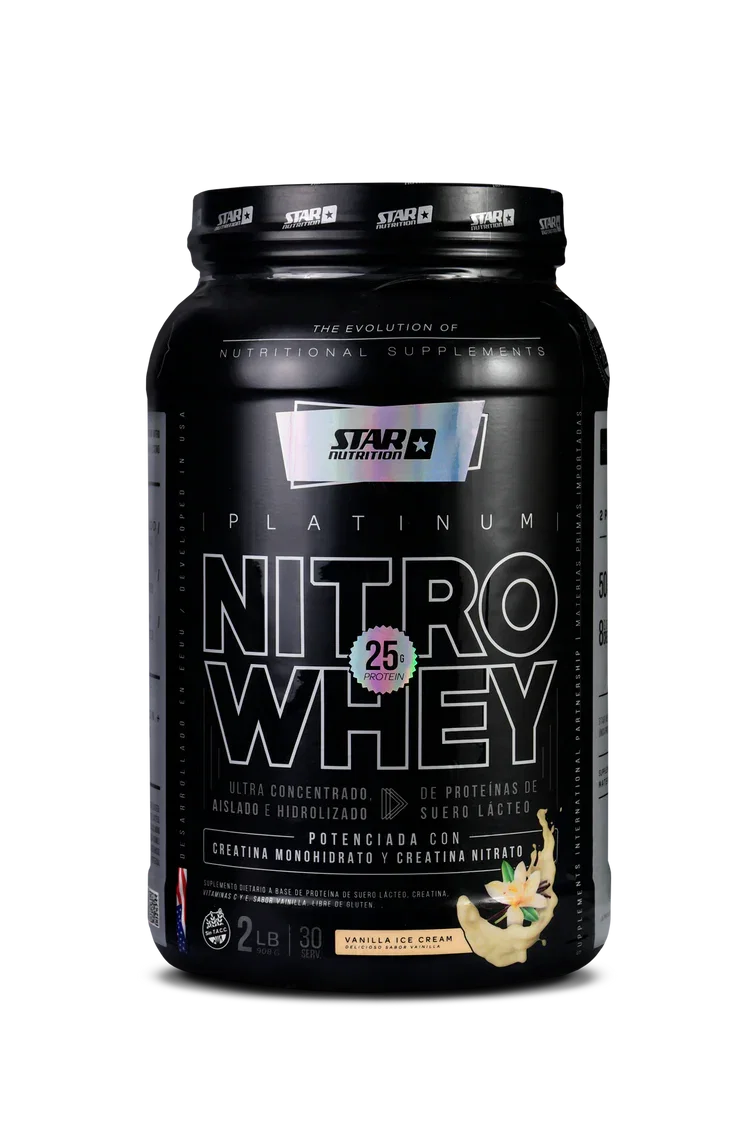 STAR NUTRITION NITRO WHEY está potenciado además con Creatina Monohidrato, Aminoácidos de cadena ramificada y enzimas digestivas, además de un exclusivo probiótico. Todo esto la convierte en la Proteína más completa.
