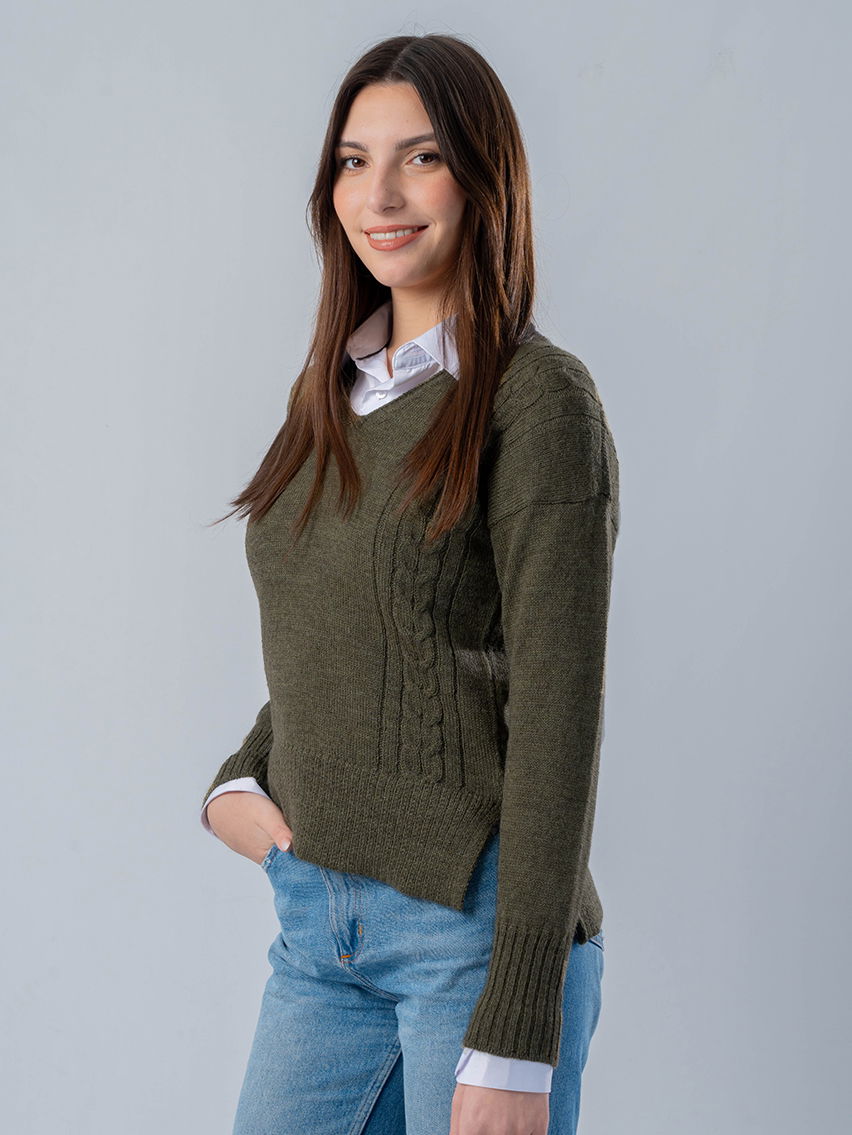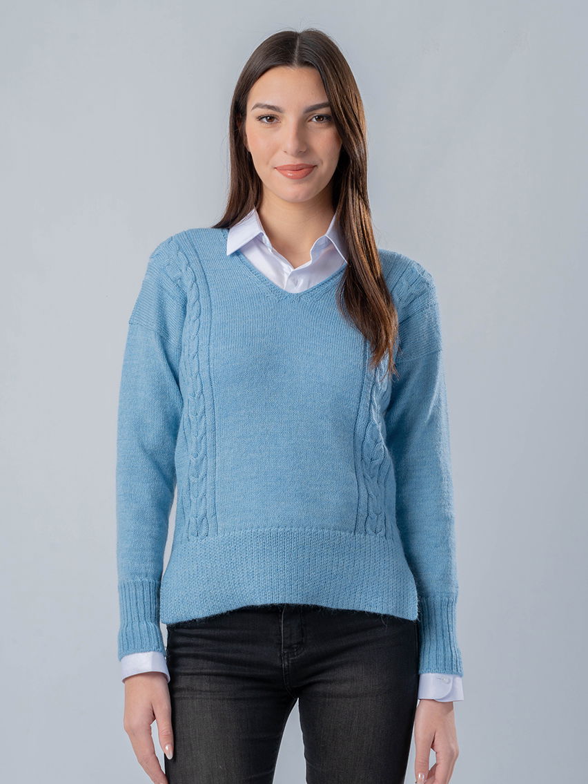 Sweater escote en “V” con trenzas en delantera. Estándar, holgado medio. Alta capacidad calórica, segunda y tercera piel. Ideal para otoño/invierno.