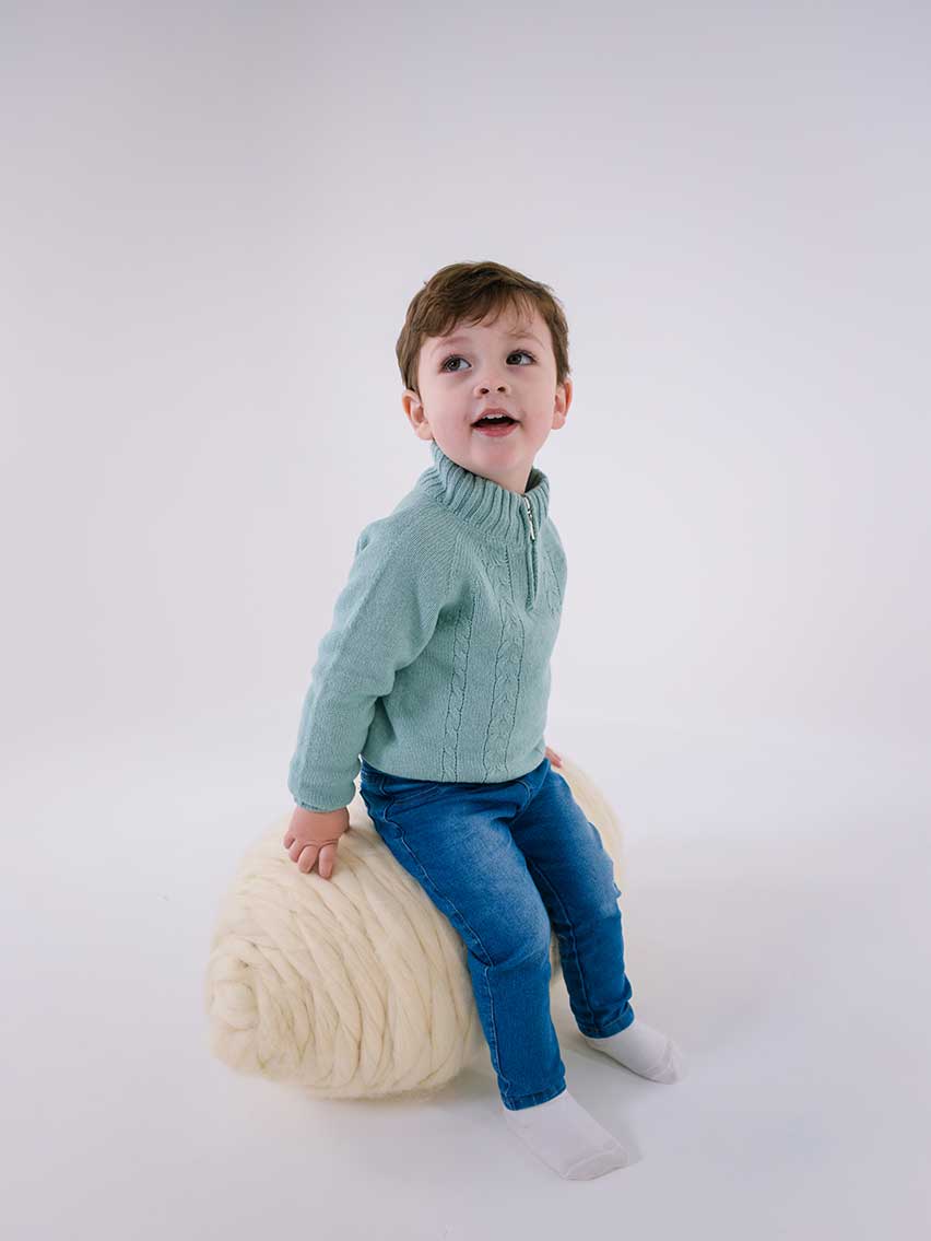 Sweater con cierre en cuello medio polo y ochos en delantera. Calce estándar. Textura suave de lana, con alta capacidad calórica, segunda y tercera piel. Ideal para otoño/invierno.